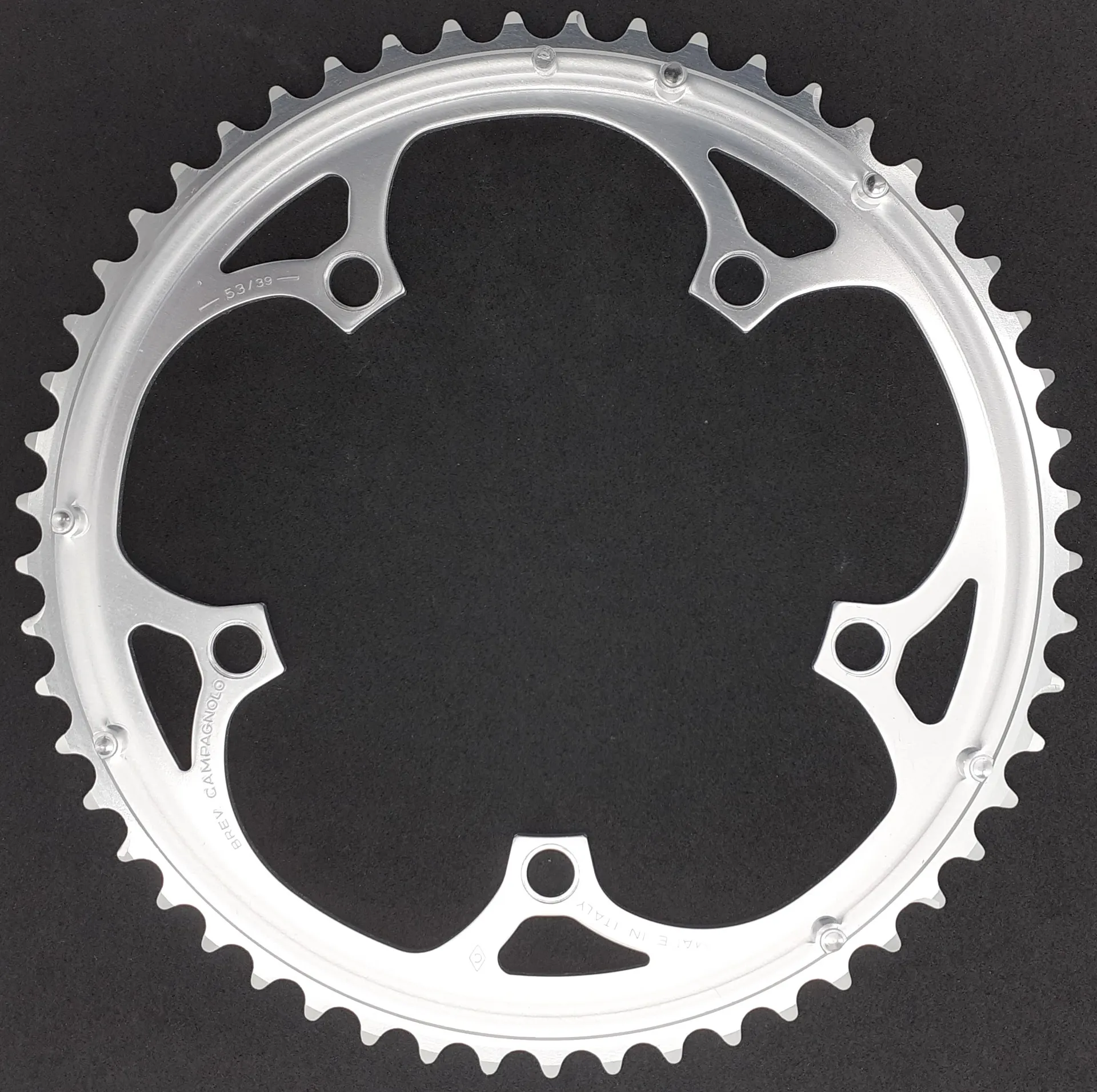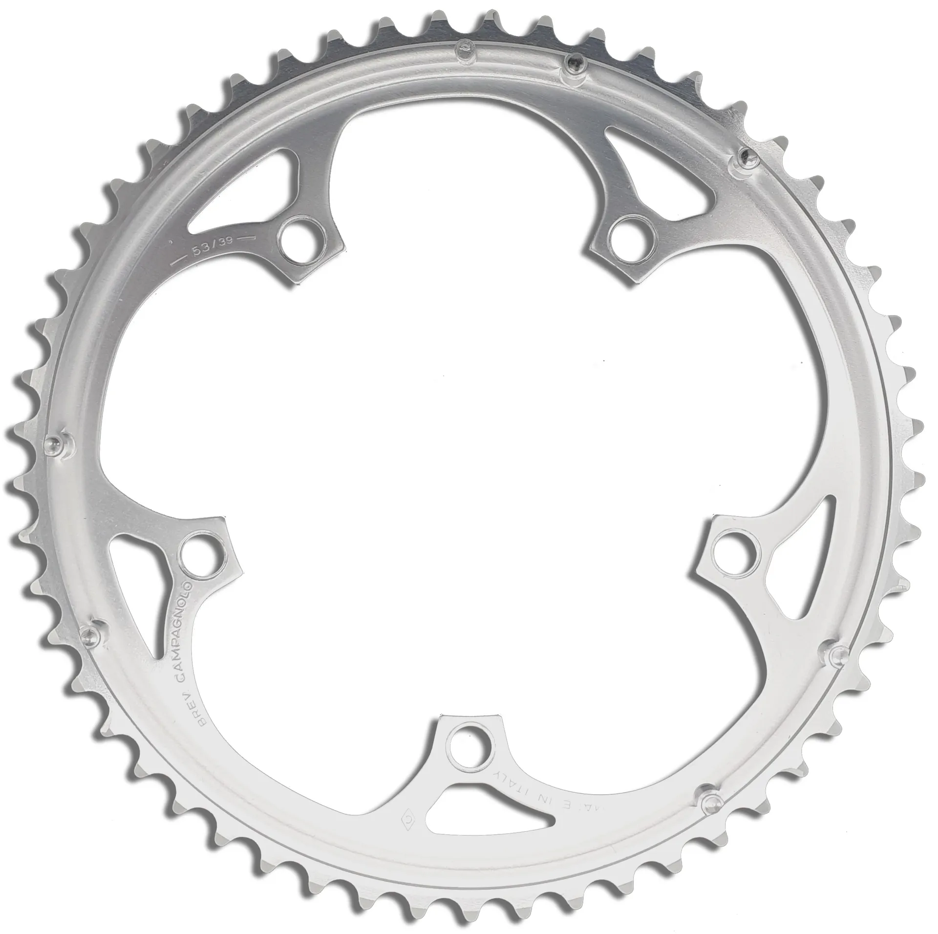 Campagnolo Veloce 130BCD 53 Tooth Chainring in SilverAs seen in the year 2000 Campagnolo parts catalogue part number FC-MI153
